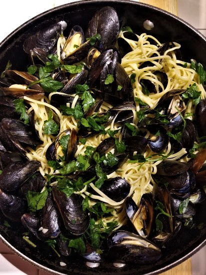 - Once the mussels have opened, add the pasta and the parsley and mix with tongs