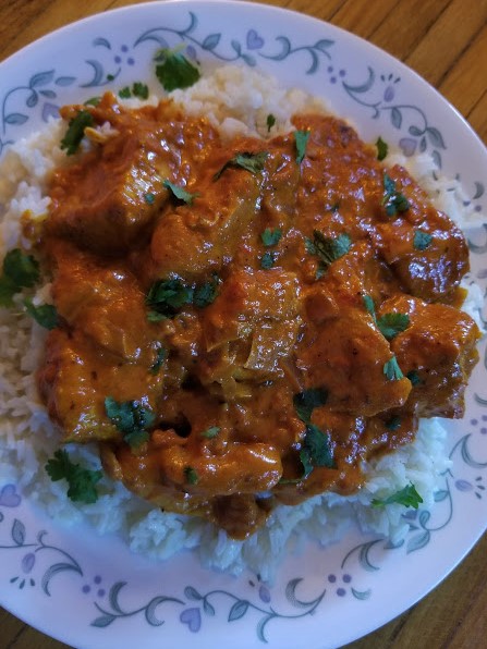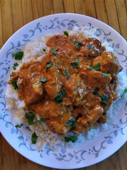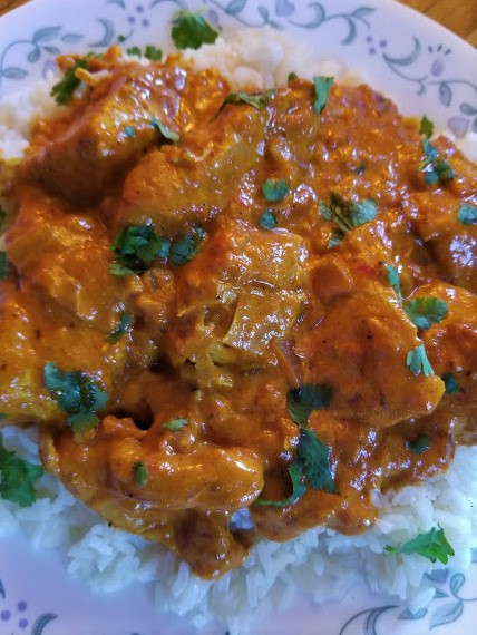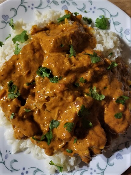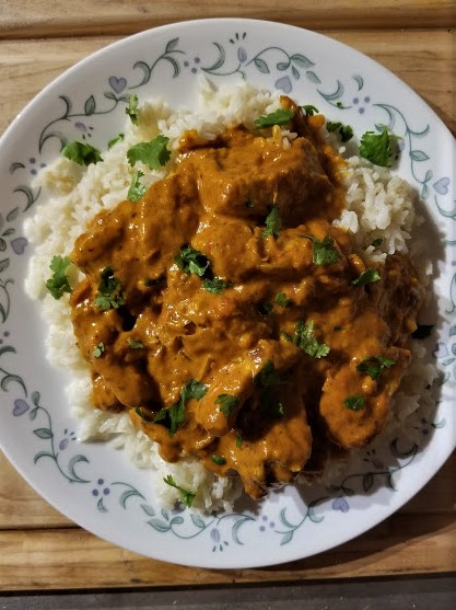 • Once the chicken has reduced, top with some chopped cilantro. Serve with some jasmine rice and naan bread. Click here  for Naan bread recipe!