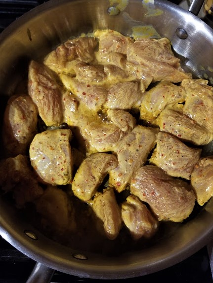 • When it is ready to cook, in a large Dutch oven or deep skillet, add the chicken chunks one by one to cook over a medium-high heat. Be sure not to crowd them. Cook them evenly about 2-3 minutes on each side depending on the size of the chunk. Remove them and place them in a paper towel lined plate. The chicken will cook more once it gets added to the sauce