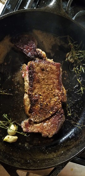 - Once the pan has heated, add the butter and let it melt. Crush the cloves of garlic with the palm of your hand and add them in the butter together with the rosemary and thyme. Let them cook for about 30 seconds