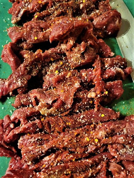 - First, generously season the meat with salt and pepper; then add a sprinkle of red chili flakes. If you enjoy it spicy, add more chili flakes