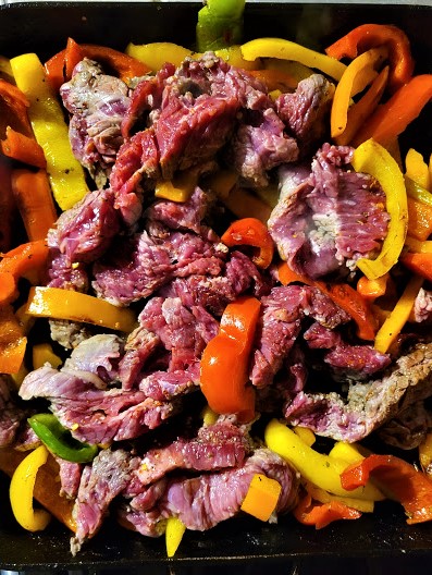 - Once the peppers begin to soften, add the meat and the mushrooms. Cook until the meat has browned, and the peppers and mushrooms have fully softened. Once that is done, set aside briefly