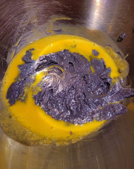 - In a separate bowl, add the egg yolks and the black sesame seed paste and whisk until paste and eggs have blended